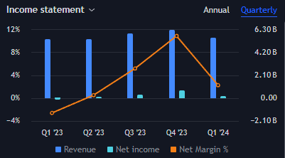 Net income showed fast growth but quickly slowed down drastically during Q1 2024.